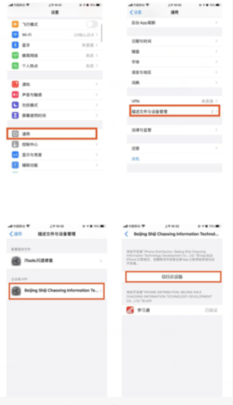苹果手机安装后打开显示“学习通”软件不受信用:打开苹果手机“设置”——“通用”——“描述文件与设备管理”——打开“学习通”——点击“信息此设备”。